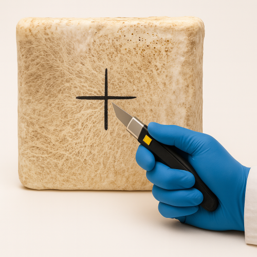 Com uma faca ou estilete higienizado, faça um corte na bolsa exatamente no local e tamanho indicados. Você pode usar fogo para esterilizar a lâmina. Evite limpar com produtos químicos que prejudiquem o desenvolvimento do micélio.